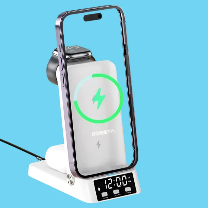 15W 4in1 Wireless Fast Charging Stand with LCD Clock Display - Magnetic Phone Watch Charger