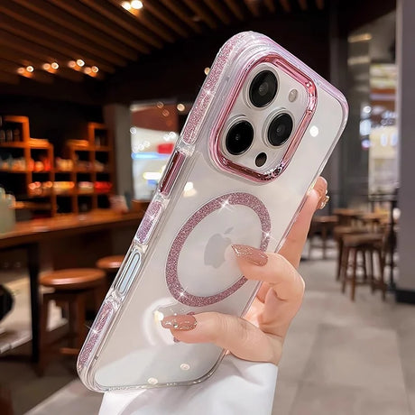 Luxury MagSafe Transparent Glitter Lens Protect Case for iPhone 16 15 14 13 Pro Max Plus
