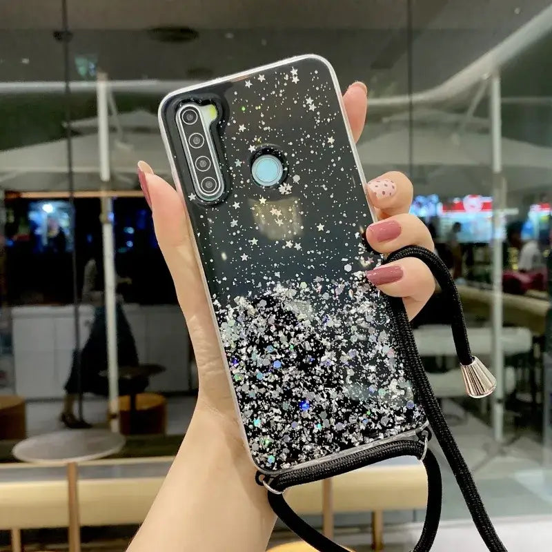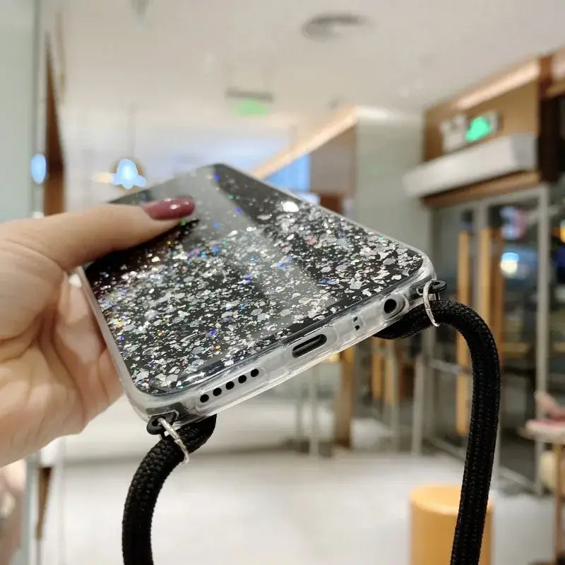 Wir stellen unsere Glitzer-Tasche mit Umhängeband vor, die für die Modelle OPPO Realme 11 Pro, C31, C35, C55, C53, Reno 10, 8, 7, 6, 5 und 8T entwickelt wurde. Diese stilvolle Tasche verfügt über schimmernde Glitzer-Akzente und enthält ein praktisches Umhängeband, mit dem Sie Ihr Telefon freihändig tragen können. Mit dieser vielseitigen Halskettenhülle können Sie Ihren Stil aufwerten und gleichzeitig sicherstellen, dass Ihr Gerät geschützt bleibt.