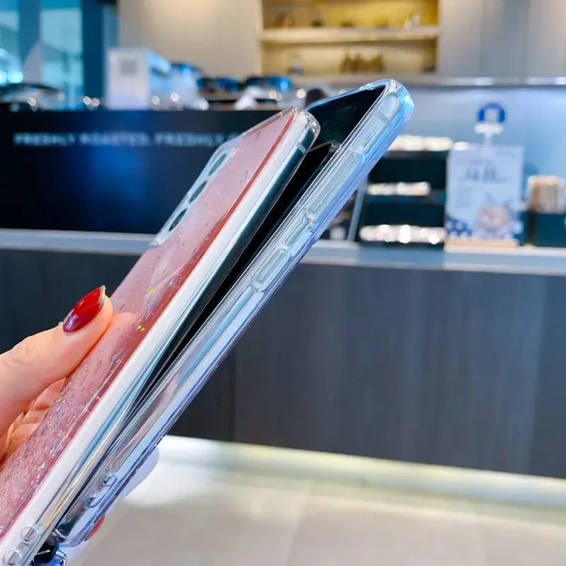 Wir stellen unsere Glitzer-Telefonhülle mit Umhängeband vor, die für die Modelle OPPO Realme 11, 10, 9 Pro Plus, C53, C55, Find X3 Lite, X5, Reno 7, 5, 6, A54 und A94 entwickelt wurde. Diese luxuriöse Bling-Hülle verleiht Ihrem Gerät Glanz und bietet gleichzeitig Funktionalität mit dem Umhängeband, das Ihnen die Hände freihält. Erhöhen Sie Ihren Stil und schützen Sie Ihr Handy mit diesem schillernden Accessoire.