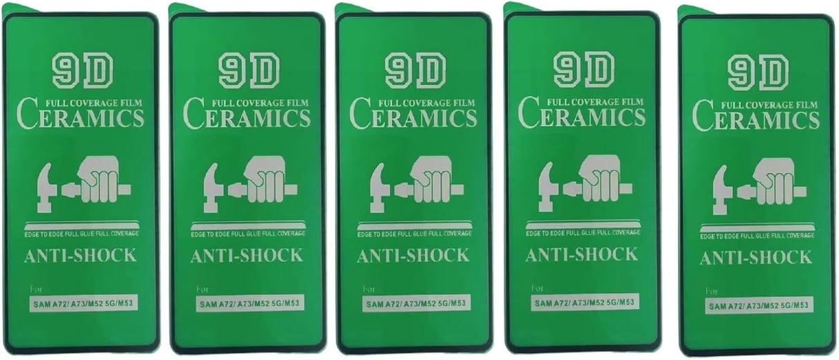 5 Pack of Ceramic Premium Flexible Screen Protectors for Samsung Galaxy A72, A73 5G, M52 5G, M53 5G. Full screen protection from common key or knife scratching & higher level (but not absolute) impact protection. Suitable for high wear everyday use.