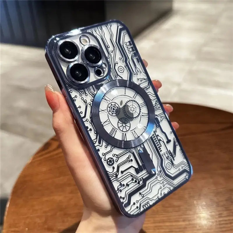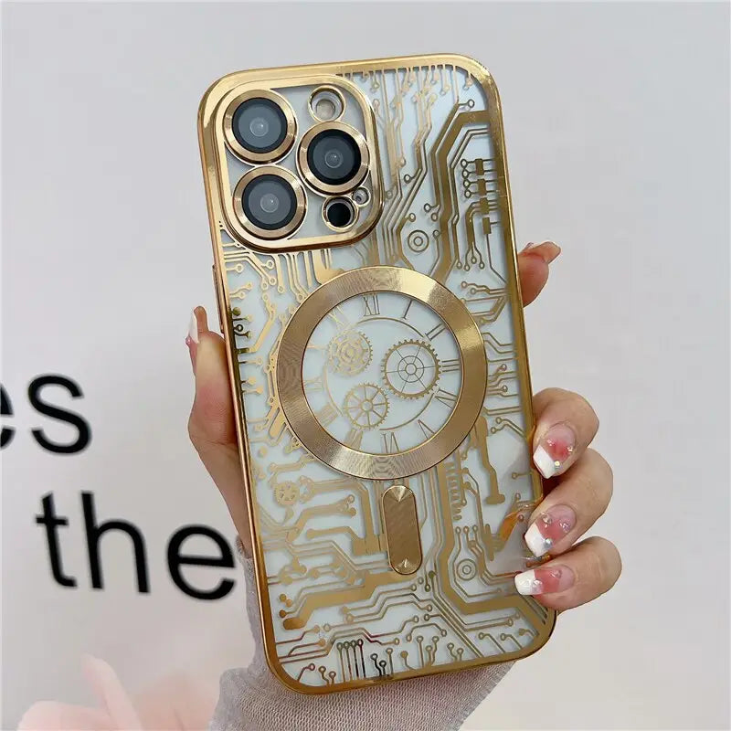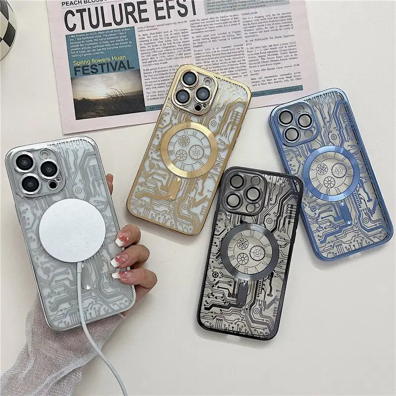 Luxuriöse, magnetische, kabellose Lade-Handyhülle mit mechanischem Muster für iPhone 11 12 13 14 Plus