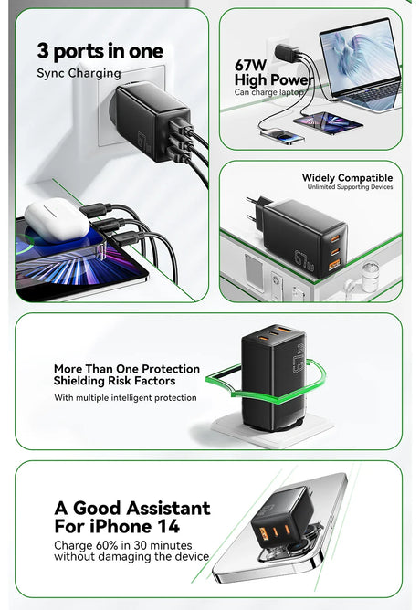 Essager 67W 3-Port GaN fast Charging Socket - USB A / Type C Power Delivery PD Phone Charger Plug