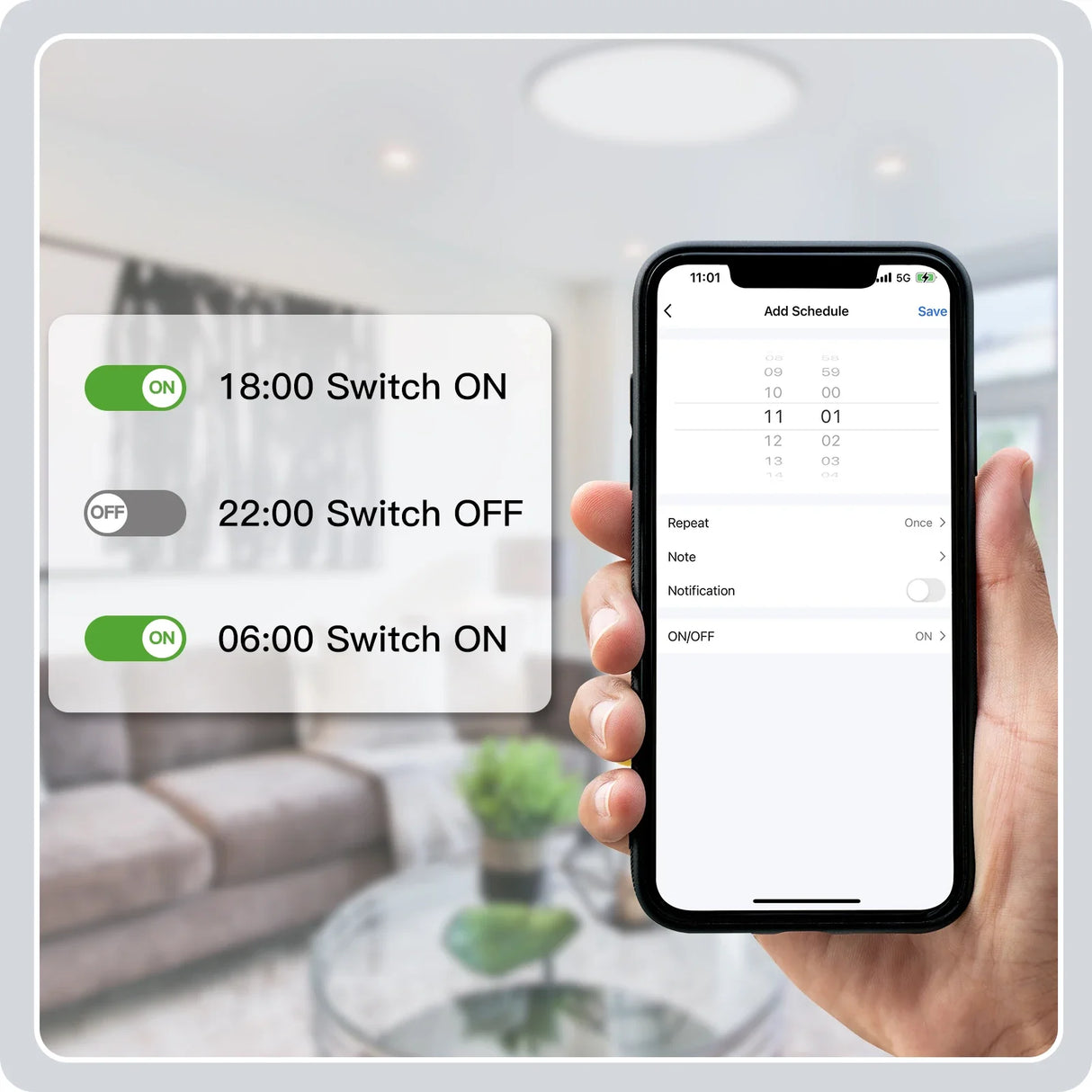 • Customizable Schedules & Timers: Set timers and schedules to automate your lighting, ensuring lights turn on/off according to your daily routine for convenience and energy savings.
