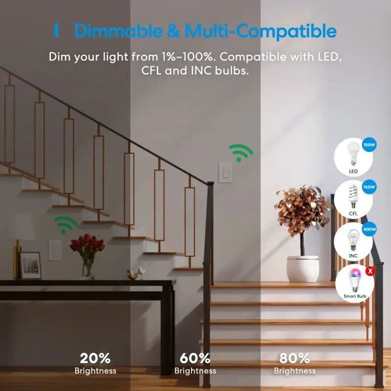 Upgrade your home lighting with the Meross HomeKit Smart WiFi Dimmer 3 Way Light Switch Kit, designed for US households. This smart switch kit offers hands-free voice control compatibility with Apple HomeKit, Alexa, Google Assistant, and SmartThings.