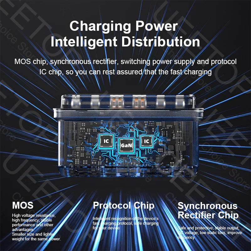 • GaN Technology: Delivers high efficiency, compact size, and reduced heat generation.