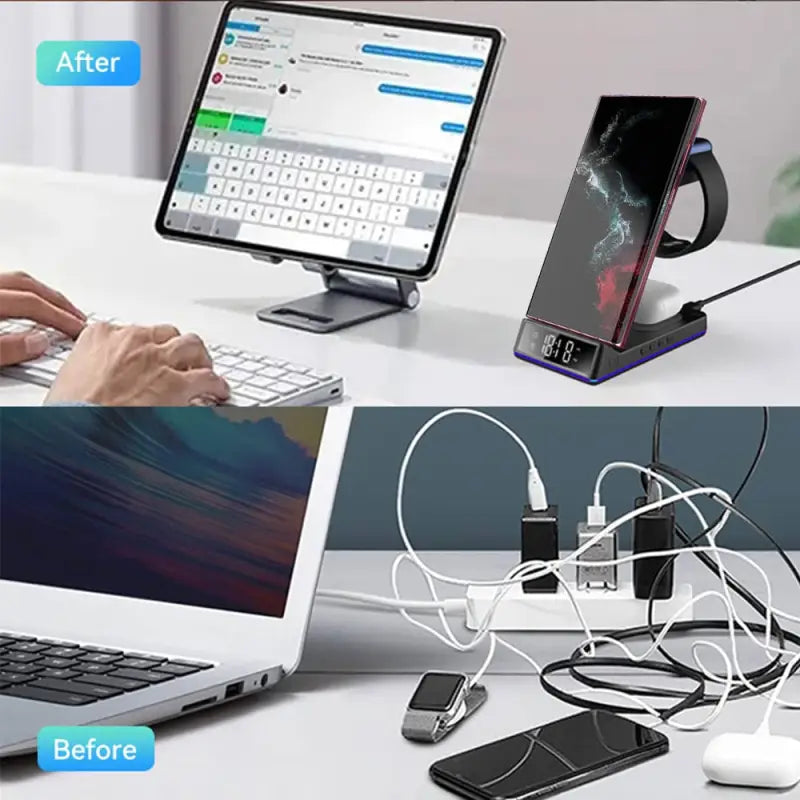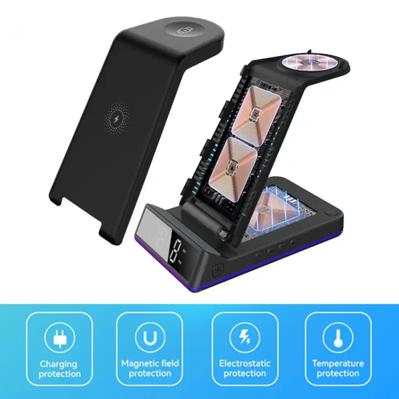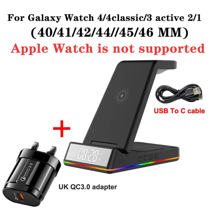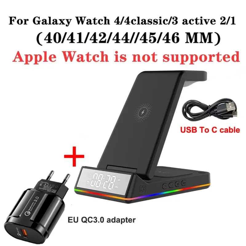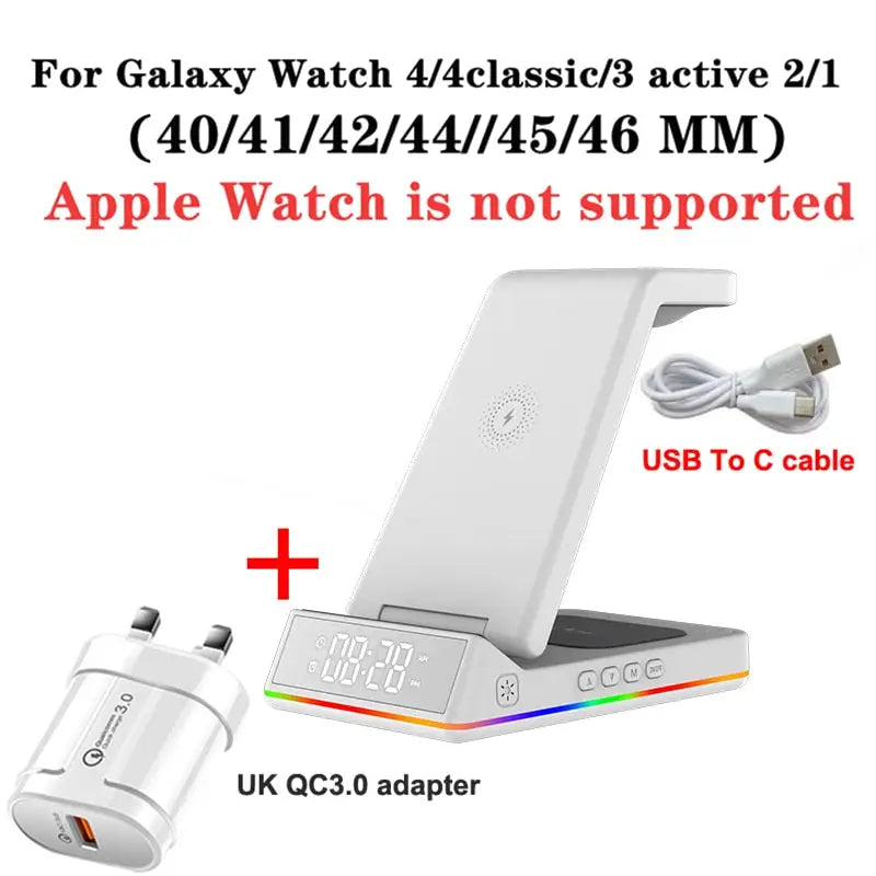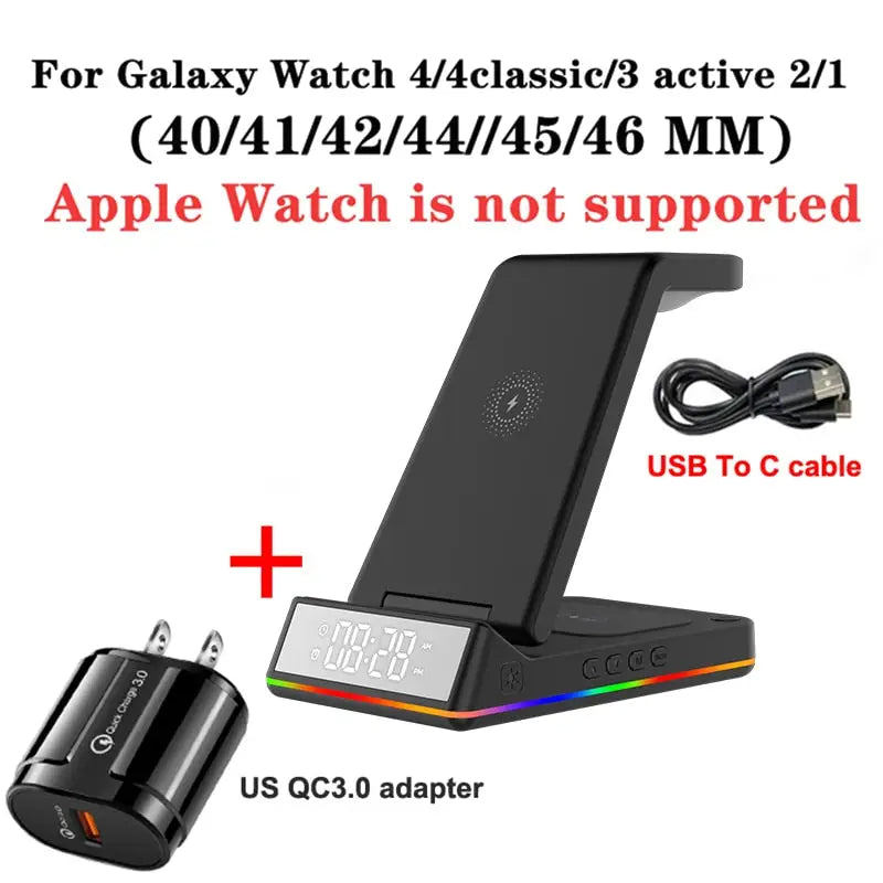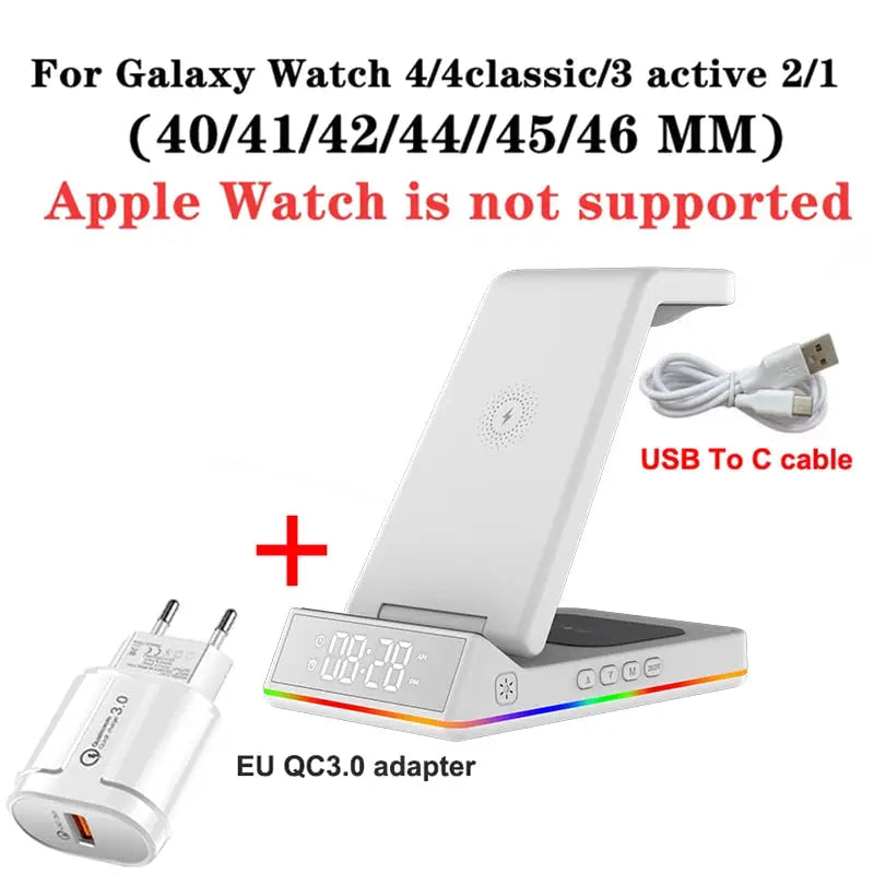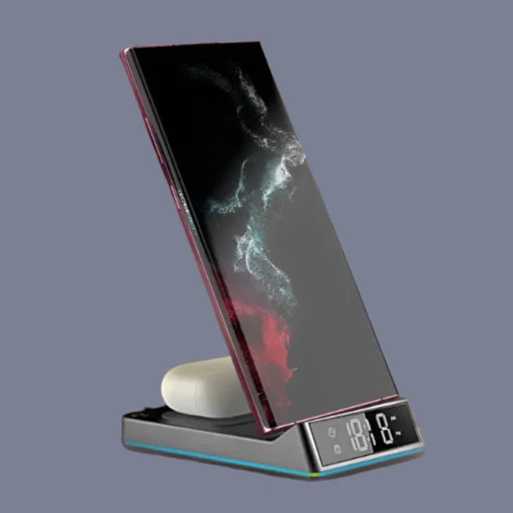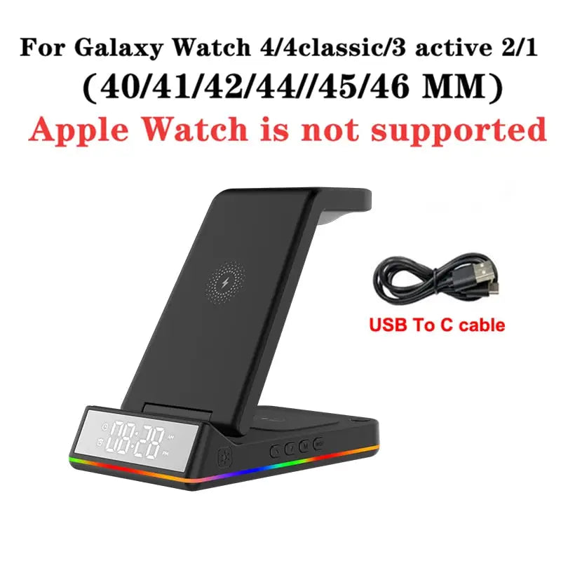 Upgrade your charging experience with our Foldable Wireless Charger Stand. Embrace the convenience of wireless charging, the ambiance of RGB lighting, and the functionality of a built-in clock. Keep your Samsung Galaxy Watch 5/4, S22, S21, and iPhone 14 Pro charged and organized with this ultimate charging station.