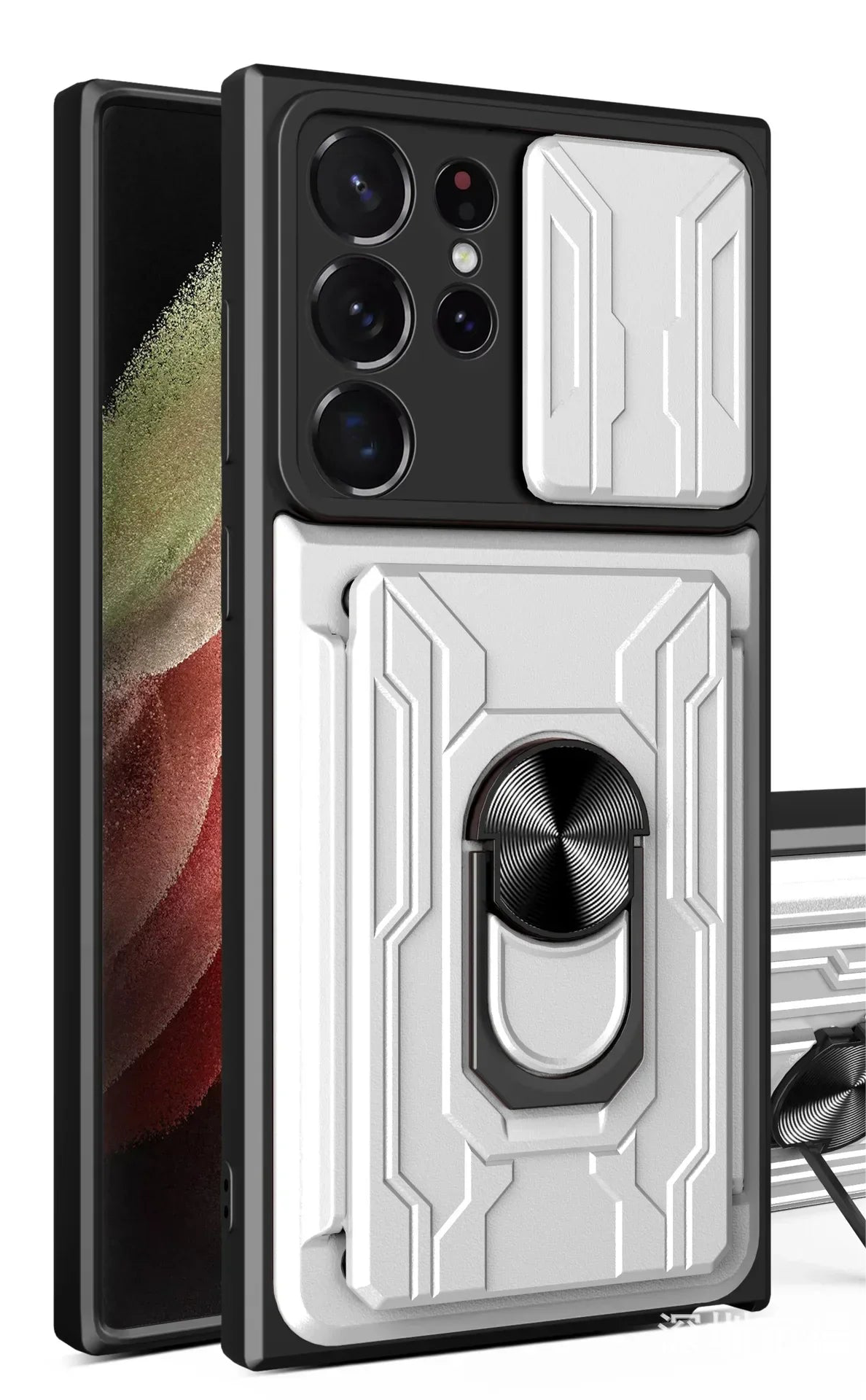 Enhance your Samsung Galaxy's protection and functionality with our Armor Case. This military-grade cover is designed for models including Galaxy S24, S23 Ultra, S23 Plus, A55, A15, A14, A54, and A25. Featuring a card slot, magnetic ring holder stand, and slide camera cover, it offers unparalleled convenience and security.