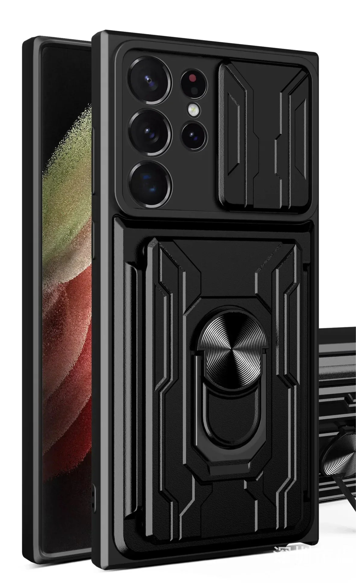 Enhance your Samsung Galaxy's protection and functionality with our Armor Case. This military-grade cover is designed for models including Galaxy S24, S23 Ultra, S23 Plus, A55, A15, A14, A54, and A25. Featuring a card slot, magnetic ring holder stand, and slide camera cover, it offers unparalleled convenience and security.