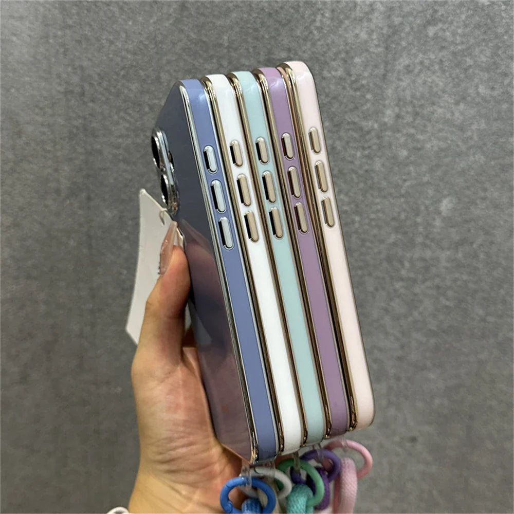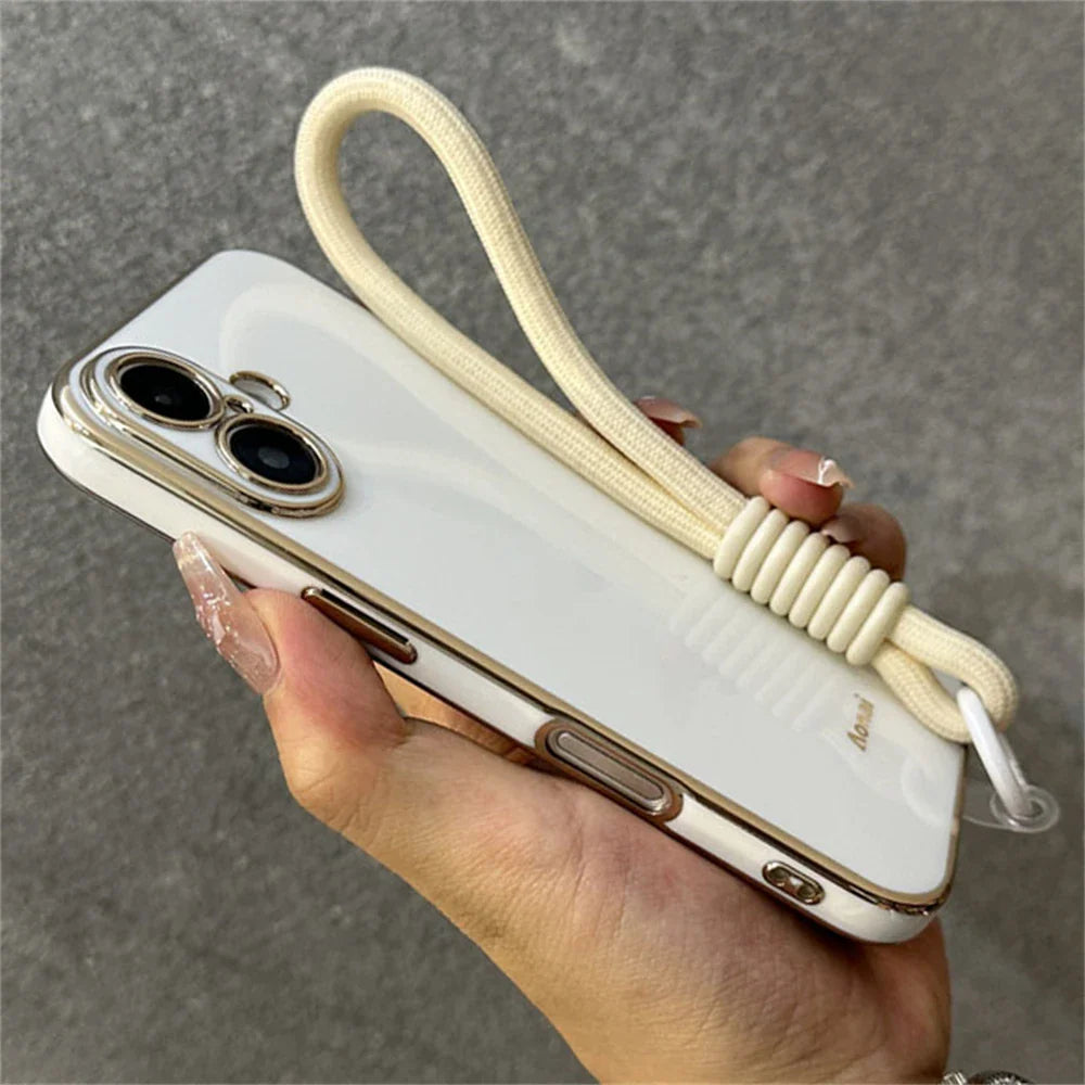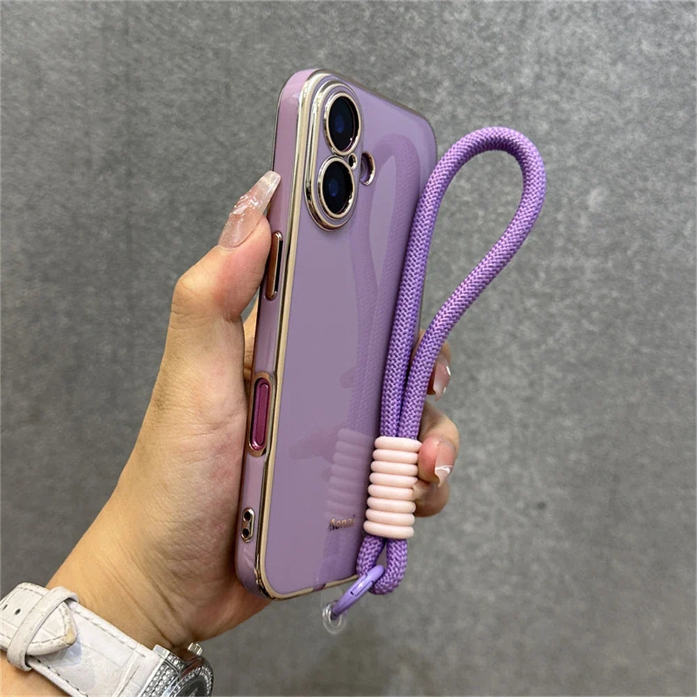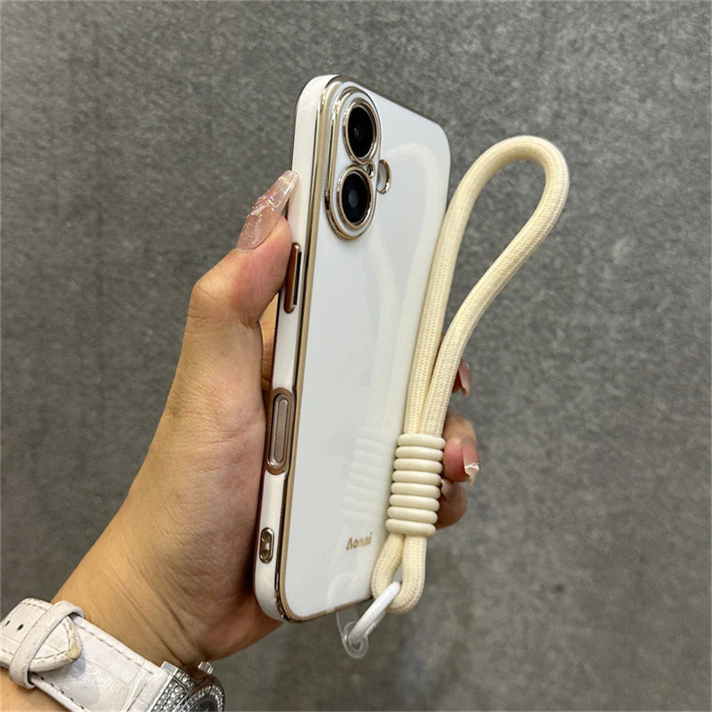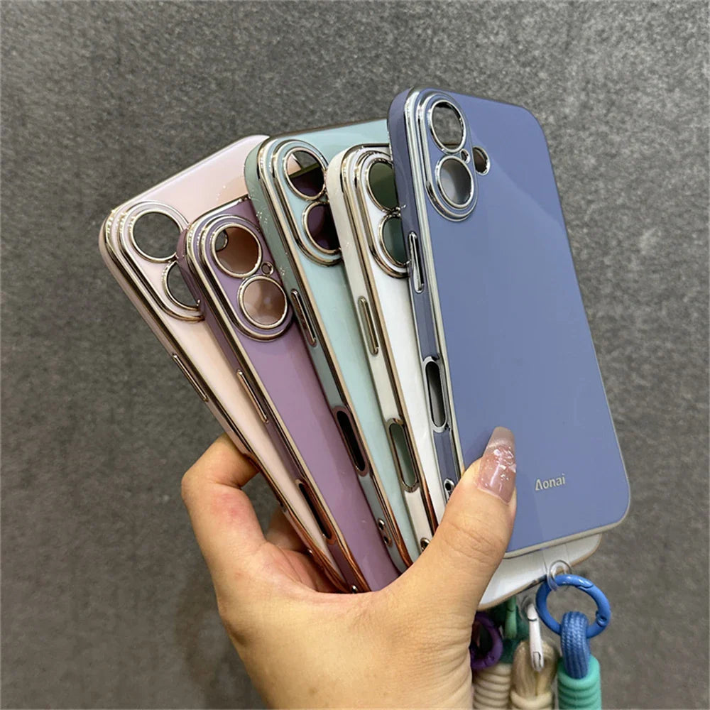 Luxury Contoured Matte Plating Case With Wrist Strap for iPhone 16 11 12 13 14 15 Pro Max Plus X XS XR SE