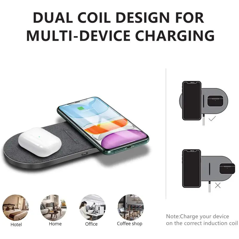 Présentation de notre chargeur sans fil double siège 2 en 1 à la pointe de la technologie, la solution ultime pour alimenter facilement vos appareils. Avec sa puissante puissance de 40 W, ce chargeur assure une charge ultra-rapide pour une gamme d'appareils, notamment les iPhones (14, 13, 12, 11, XS, XR, X), les AirPods 3 Pro et les smartphones Samsung (S22, S21). .