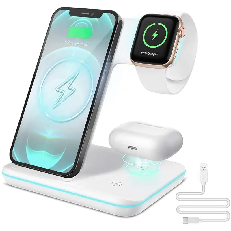 Présentation de notre support de chargeur sans fil 3 en 1, la solution de chargement ultime pour votre iPhone 14, 13, 12, 11, XS, XR, X, 8, Apple Watch 7, 6, AirPods Pro et iWatch. Cette station de recharge rapide allie commodité, polyvalence et style pour garder tous vos appareils essentiels sous tension et organisés.