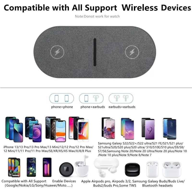 Présentation du double chargeur sans fil 40 W : découvrez la commodité ultime de charger plusieurs appareils simultanément avec ce tapis de chargeur rapide 2 en 1. Conçu pour fournir une recharge efficace et fiable pour votre iPhone, Airpods et autres appareils compatibles.
