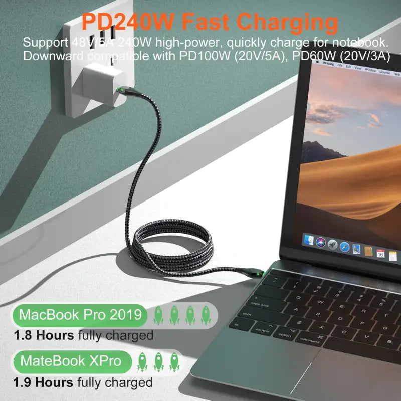 Compatibilité universelle : le câble PD 240 W Type C vers Type C est compatible avec une large gamme d'appareils, notamment Samsung, Huawei, Xiaomi, OPPO, les smartphones Oneplus, Macbook, iPad et autres appareils dotés de ports USB Type C. Il offre des capacités efficaces de chargement et de transfert de données pour une variété d’appareils.